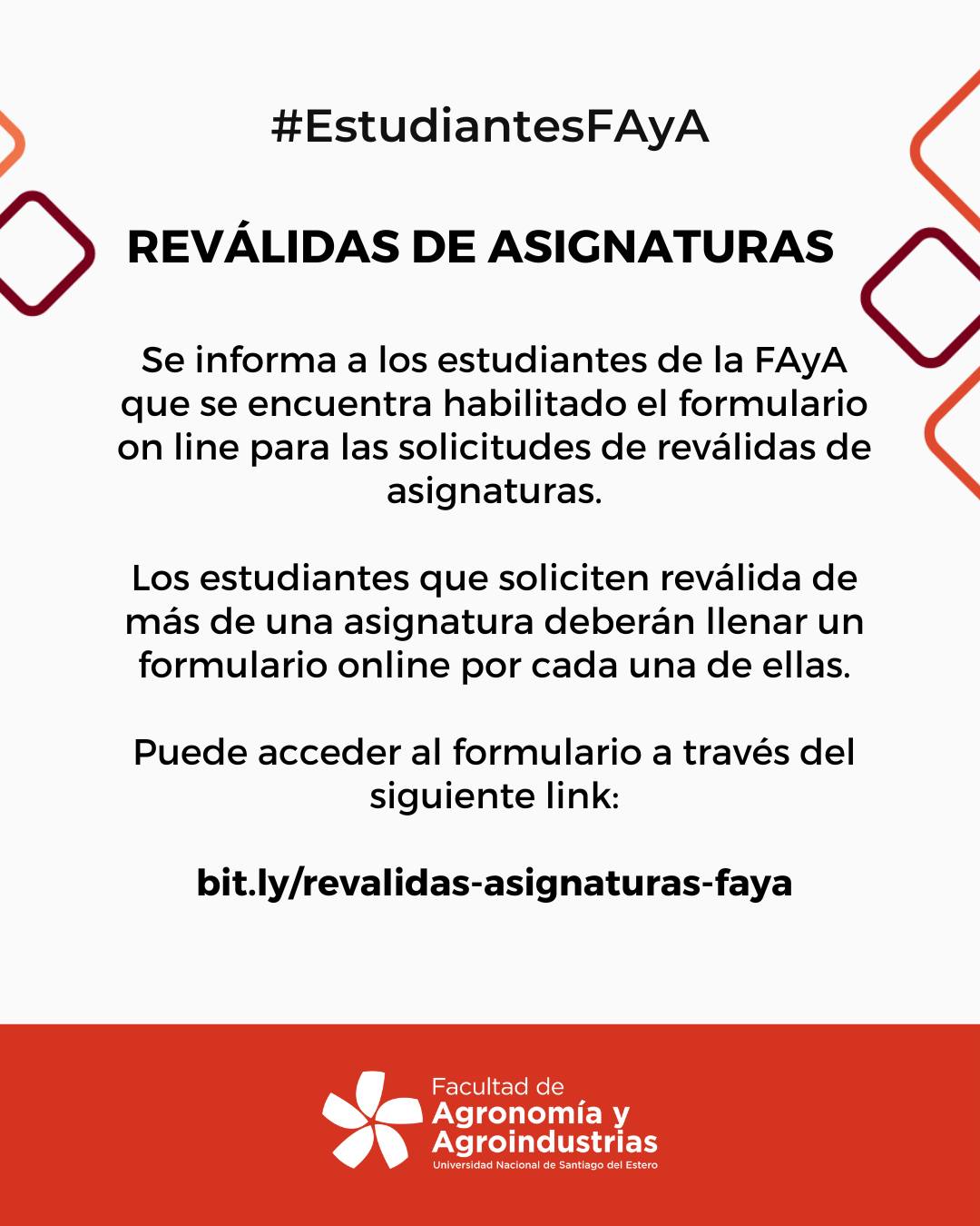 Se informa a los estudiantes de la FAyA que se encuentra habilitado el formulario on line para las solicitudes de reválidas de asignaturas. Los estudiantes que soliciten reválida de más de una asignatura deberán llenar un formulario online por cada una de ellas. Puede acceder al formulario...
