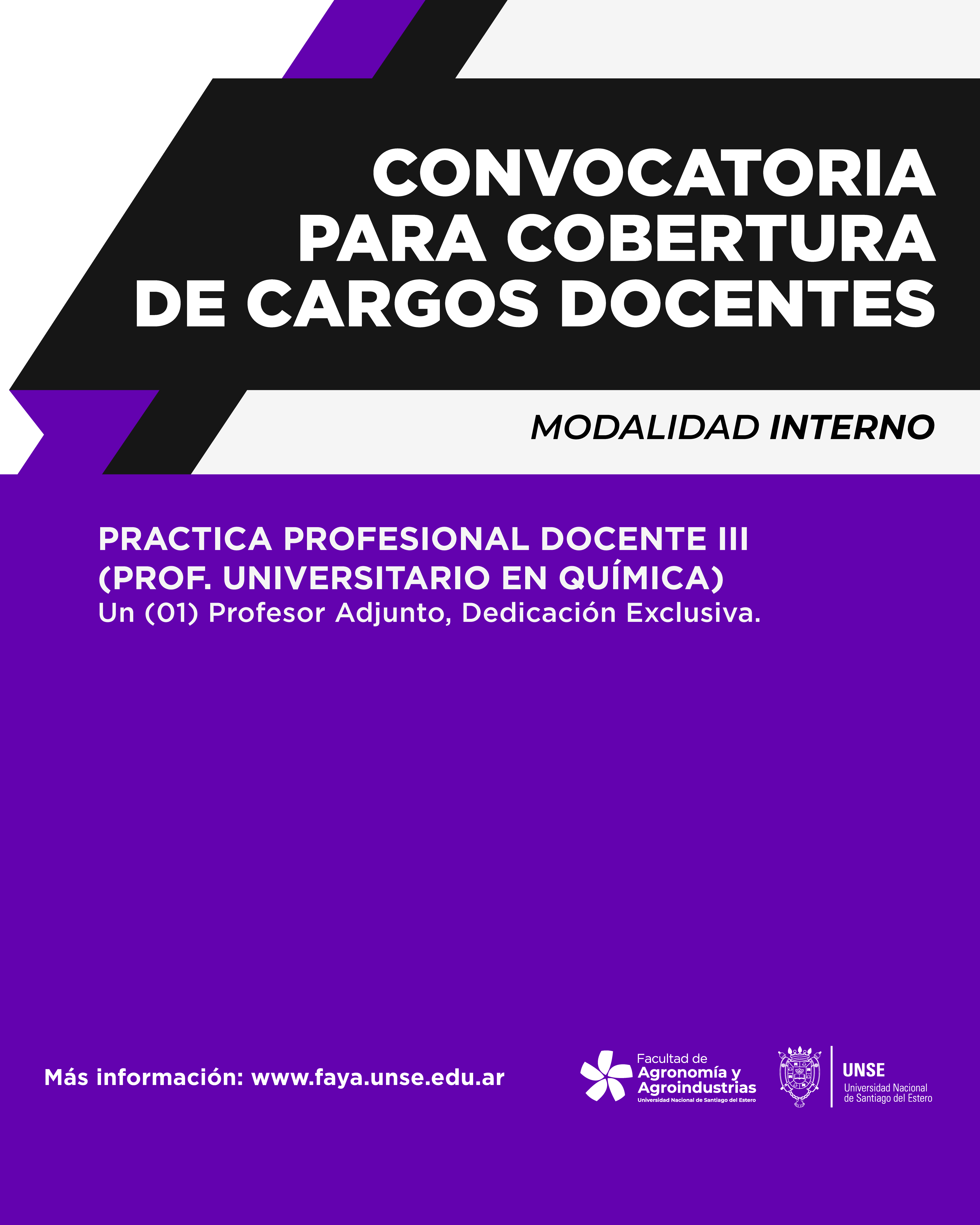 La Facultad de Agronomía y Agroindustrias de la Universidad Nacional de Santiago del Estero comunica a los señores interesados que por Resolución FAA Nº 094/2026, se Declara Abierta la Inscripción de postulantes para la cobertura de un (01) cargo de Profesor Adjunto, Dedicación Exclusiva, mediante...