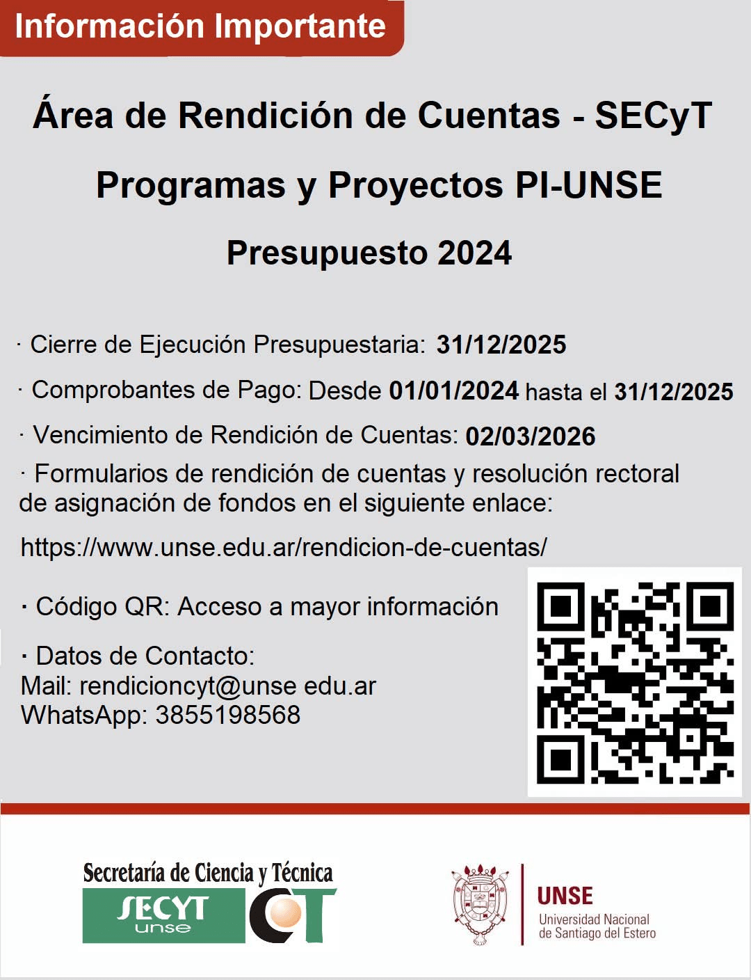 El Área de rendición de cuentas de la Secretaria de Ciencia y Técnica de la UNSE, informa: