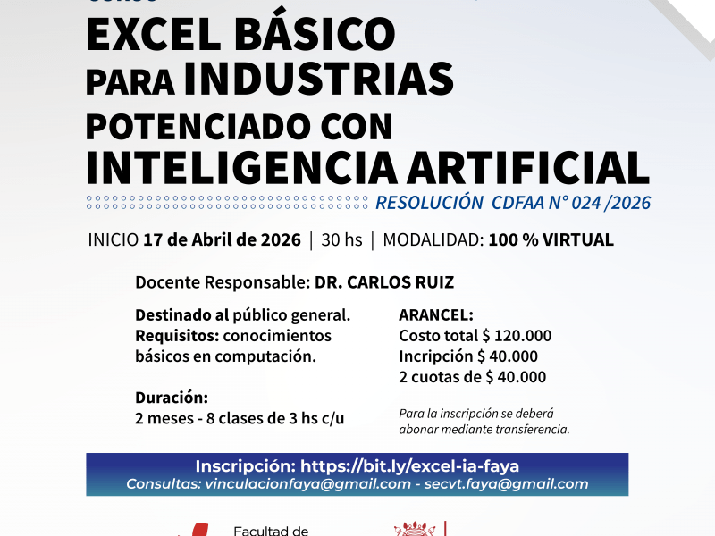 Aprobado por Resolución CDFAA 024/2026 📆 INICIO 17 de Abril de 2026 | 30 hs |📣 MODALIDAD: 100 % VIRTUAL Docente Responsable: DR. CARLOS RUIZDestinado al público general.Requisitos: conocimientos básicos en computación. Duración: 2 meses – 8 clases de 3 hs c/u Inscripción: https://bit.ly/excel-ia-fayaConsultas: vinculacionfaya@gmail.com...