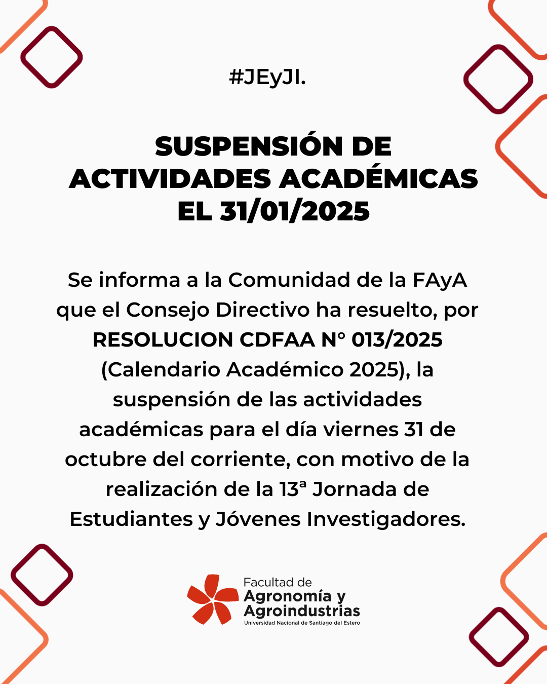 Se informa a la Comunidad de la FAyA que el Consejo Directivo ha resuelto, por RESOLUCION CDFAA N° 013/2025 (Calendario Académico 2025), la suspensión de las actividades académicas para el día viernes 31 de octubre del corriente, con motivo de la realización de la 13ª...