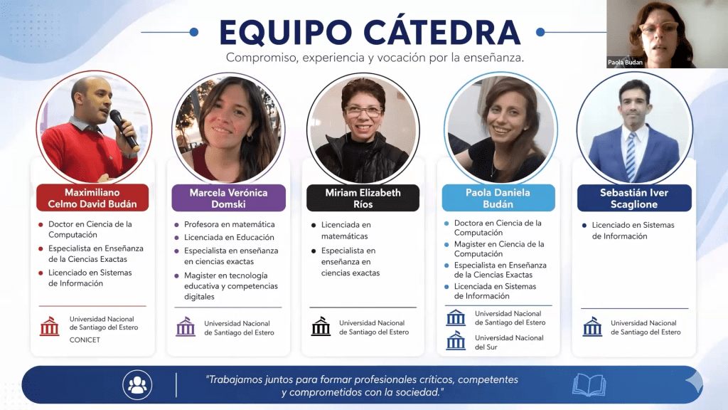 El equipo docente está liderado por el Dr. Maximiliano Budán, quien se desempeña como director de la carrera, y cuenta con la participación de la Dra. Paola Budán, la Lic. Miriam Ríos, el Lic. Sebastián Scaglione y la Lic. Marcela Domski. Los docentes destacaron que la formación no solo abordará el uso de herramientas tecnológicas en la docencia, la investigación y la gestión, sino que promoverá activamente el pensamiento crítico.